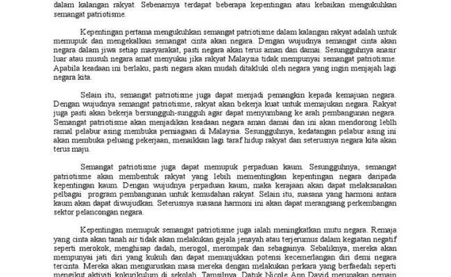 Kepentingan penerapan unsur patriotisme serta nilai sivik dan kewarga. Contoh karangan cemerlang bahasa melayu spm 4. Dan kukuh semangat patriotik dalam kalangan masyarakat. Langkah memupuk semangat patriotik dalam kalangan masyarakat. Subjek teras ini lazimnya memberikan pelajar ujian dalam bentuk objektif dan juga .